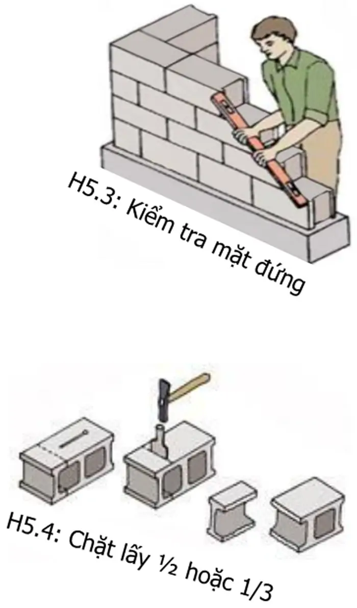 Để xây chèn hai đầu hoặc xây sole không trùng mạch bạn dùng viên 1/2, hoặc 1/3 để xây (xem H5.4).