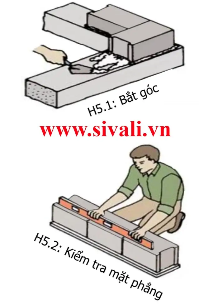 Đặt viên gạch đầu tiên tại vị trí góc tường trùng đường biên đã căn chỉnh, đặt viên gạch tiếp theo theo chiều vuông góc với viên gạch đầu tiên. (xem H5.1).