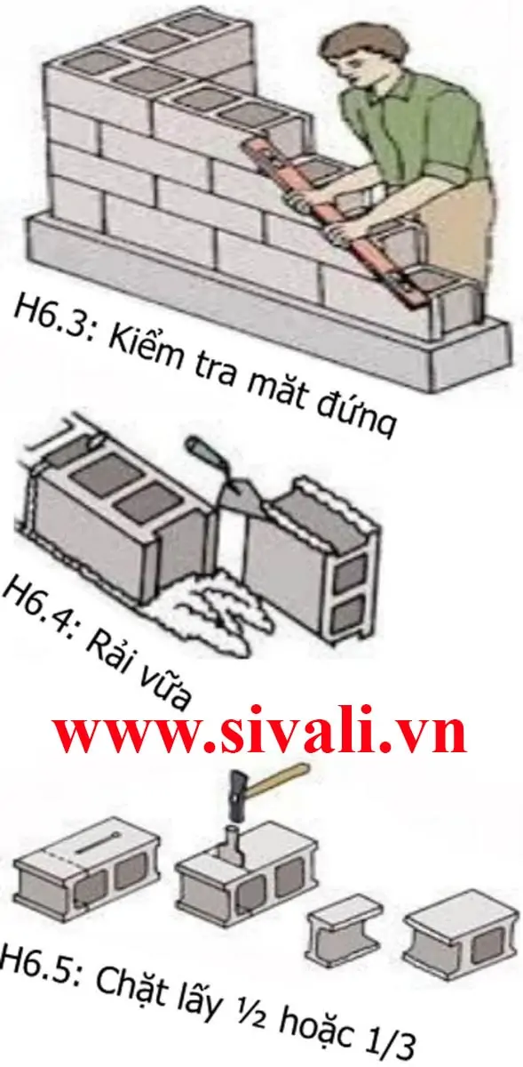 Sau khi xây được 2 đến 4 hàng gạch bạn dùng li vô hoặc thước để kiểm tra cho thẳng hàng (Xem H6.3).