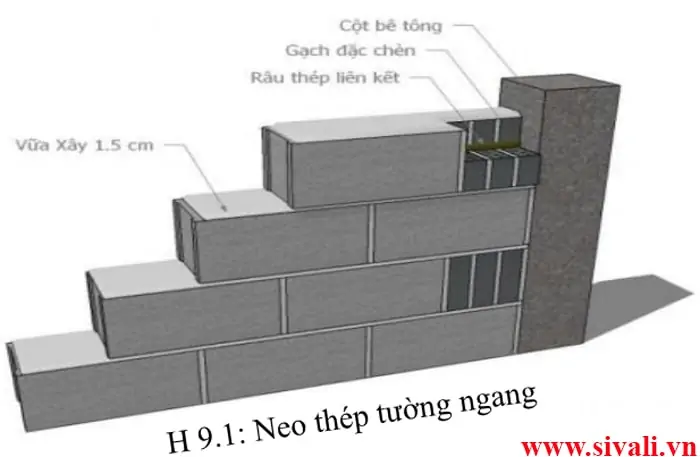 Liên kết giữa tường gạch block bê tông và cột bê tông được thực hiện theo phương pháp truyền thống: Chừa râu thép tại cột hoặc sử dụng bản sắt đã khoan lỗ với chiều dày 3mm bẻ thành hình chữ L: Khoảng cách giữa các dâu từ 500 đến 600 mm thì gắn một lượt râu thép để tăng tính liên kết giữa tường và cột bê tông (tương tự quy cách xây tường bằng gạch đất sét nung). Tại vị trí có râu bắt buộc dùng gạch đặc để chèn (xem H 9.1).