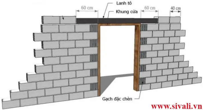 Khi xây khung cửa đi, tại vị trí “viên nửa” không dùng phần cắt ra của gạch lỗ để chèn. Xây gạch đặc chèn để tạo mặt phẳng và đủ kết cấu gắn kết với khung cửa.