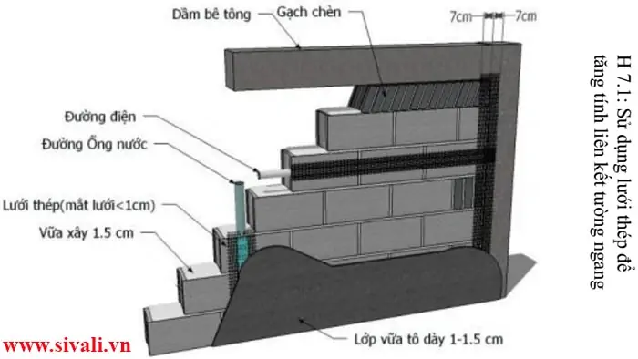 Tại các vị trí tường gạch liên kết với cột bê tông, hoặc có hệ thống ống âm tường như rãnh dây điện, rãnh ống nước, vị trí tiếp giáp giữa tường gạch và đà lanh tô (lintel) phải sử dụng lưới thép trùm qua hai bên từ 7-10 cm (trước khi trát) để chống nứt tường. Kích thước ô lưới không lớn hơn 1 cm.