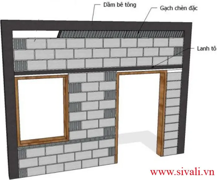 Đà lanh tô (lintel) trên cửa có thể đổ bê tông trực tiếp hoặc đúc sẵn. Chiều rộng bằng chiều rộng viên gạch, chiều dài gối vào tường mỗi bên bằng 1,5 chiều dài viên gạch. VD: viên gạch dài 400mm thì lanh tô mỗi bên dài 600mm).