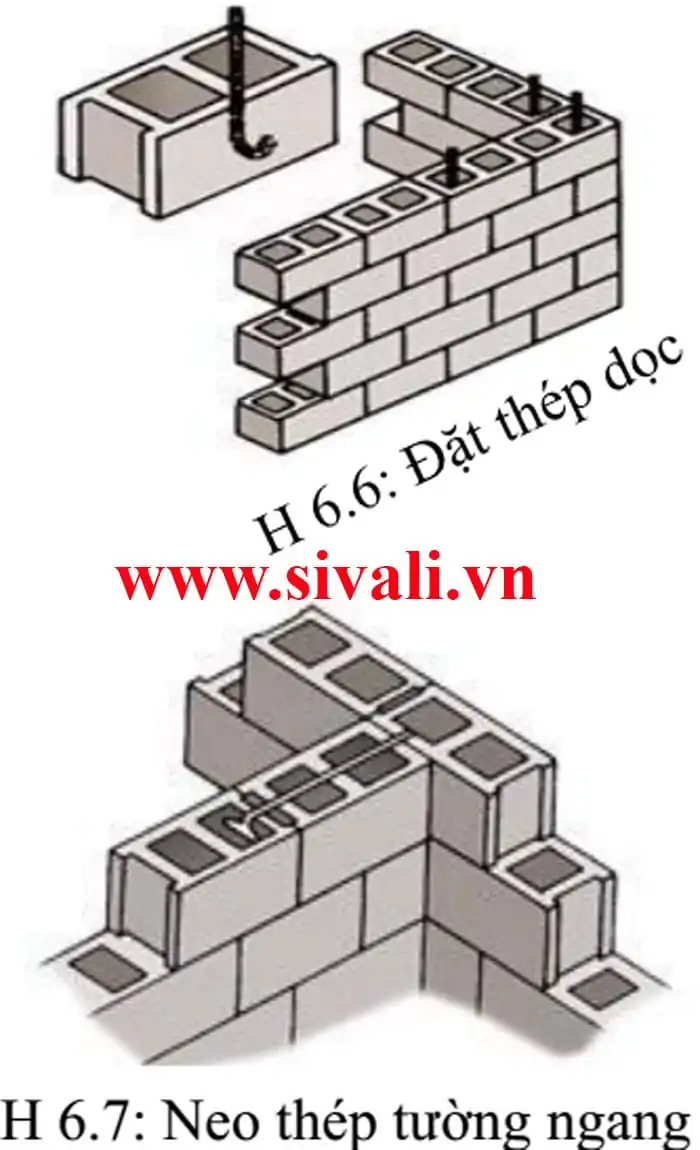 Các hàng tiếp theo chỉ việc rải vữa ở thành viên gạch (Xem H6.4), những lỗ gạch có cốt thép thì lấp đầy bê tông vào tạo thành một cột bê tông cốt thép.