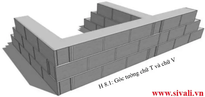 Góc tường chữ T và chữ V liên tục sẽ dùng phương pháp câu gạch, chú ý nếu trùng mạch phải thay đổi viên ½ hoặc 1/3 để không trùng mạch xây giữa các hàng xây.